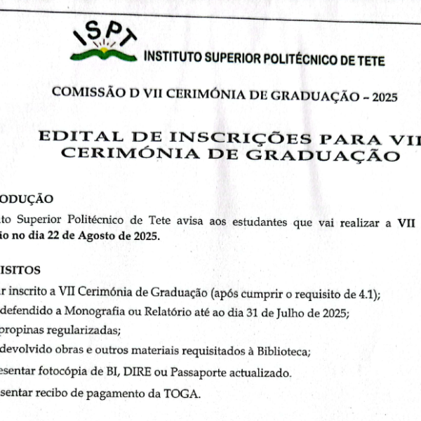 O Instituto Superior Politécnico de Tete avisa aos estudantes que vai realizar a VII Cerimónia de Graduação no dia 22 de agosto de 2025